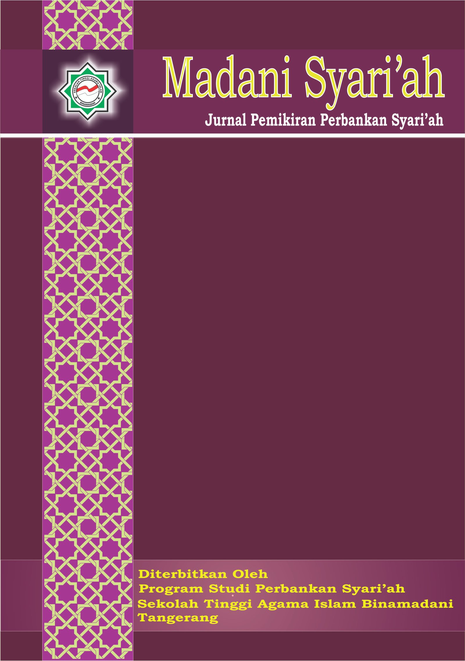 Madani Syari'ah: Jurnal Pemikiran Perbankan Syariah diterbitkan oleh Program Studi Perbankan Syariah Sekolah Tinggi Agama Islam (STAI) Binamadani, Tangerang. Bidang kajian jurnal ini mencakup pemikiran tentang perbankan syariah, sistem informasi perbankan syariah, manajemen risiko perbankan syariah, manajemen marketing perbankan syariah, manajemen lembaga keuangan syariah, etika keuangan syariah, sistem ekonomi Islam, dan lainnya.
